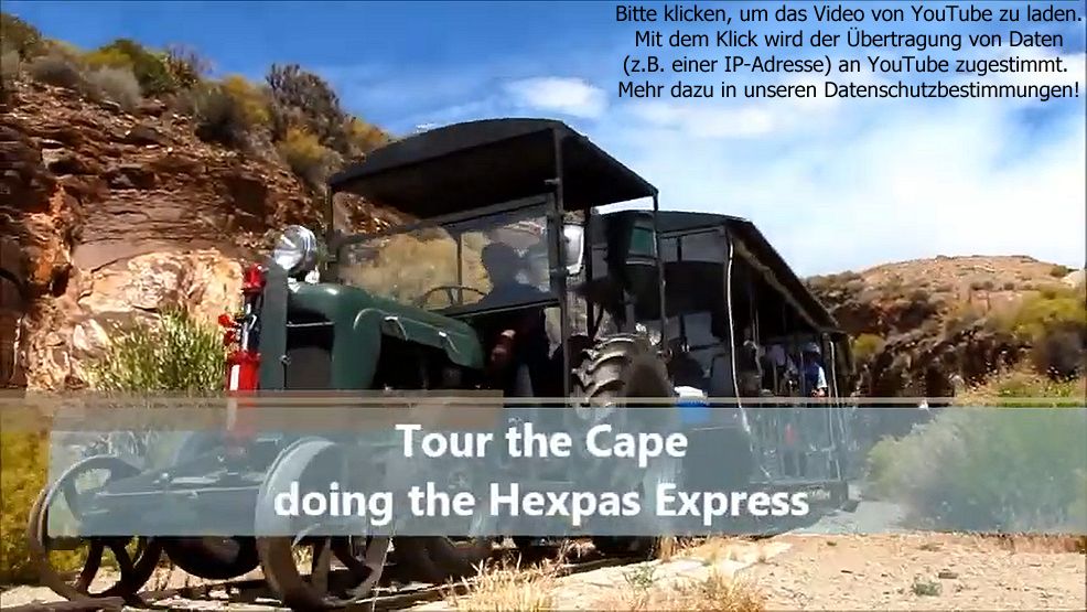 Ein alter Trecker zieht Passagieranhänger auf der alten Eisenbahnlinie hinauf zum Hex River Pass (4–7 Std.): wunderschöne Landschaft, historische Tunnel und grandiose Ausblicke. Startpunkt: Veldskoen Farm Stall. Auch Mountainbiketouren und Wanderungen. Buchung: Tel. (083) 292-0348.