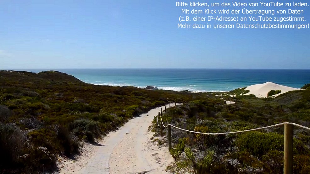 Die Küste des De Hoop NaturreservatEin toller Blick über die davor liegende Küstenebene eröffnet sich dem Betrachter: Das 14 km lange „Vlei“, mit dem Flusslauf des Salt River, 5 km entfernt am Horizont ein weißes, nur z. T. bewachsenes Dünenmeer und dahinter das tiefblaue Meer, dessen Küstenzone als Maritime Reserve geschützt ist. Dieser Ausblick fasziniert umso mehr, als man ihn so nicht erwartet hätte.
