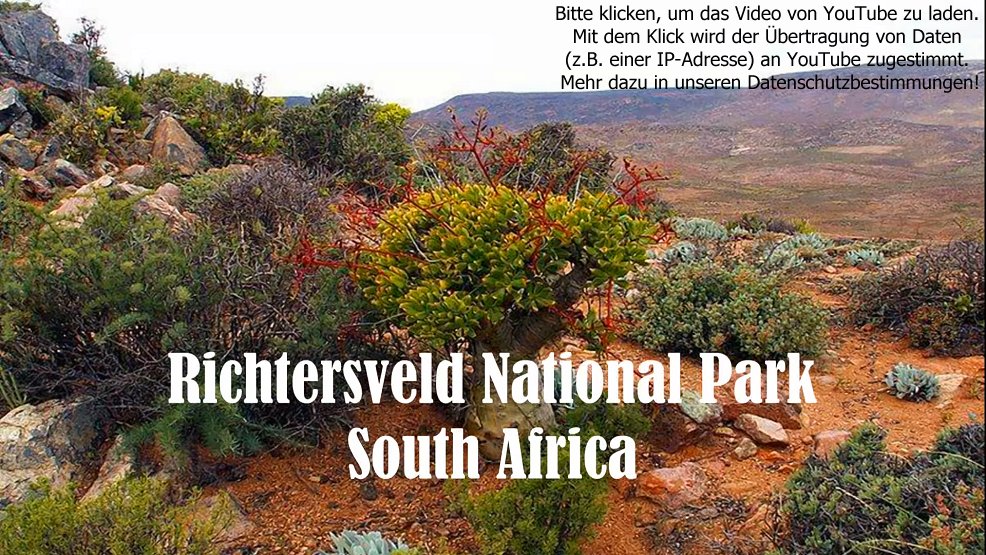 Der 1.625 qkm große Richtersveld National Park, eine typische Bergwüstenlandschaft, nördlich begrenzt durch den Oranje River, wurde erst 1991 der Öffentlichkeit zugänglich gemacht.